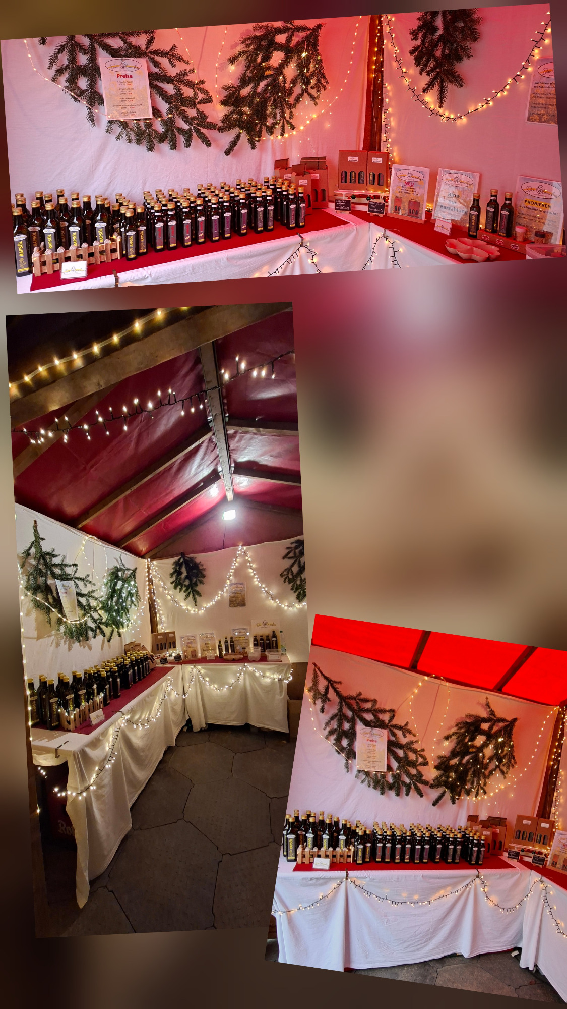 Abgefüllt wird mit der Hand unser Ölsortiment Rapsöl 500 ml Chiliöl mild/scharf 250ml Knobiöl 250 ml Salatöl 250ml, Tomate-Mozzarella 250ml